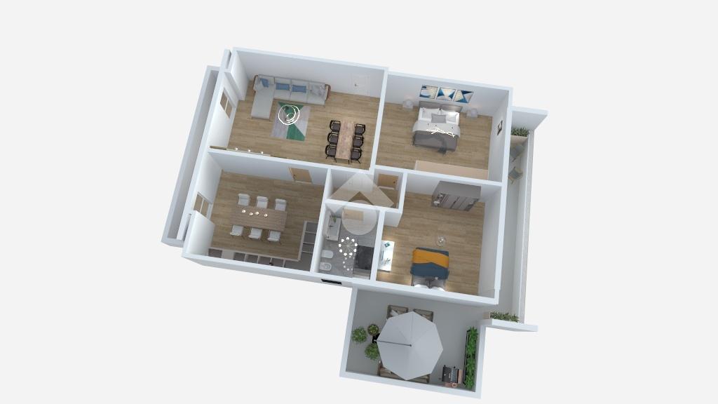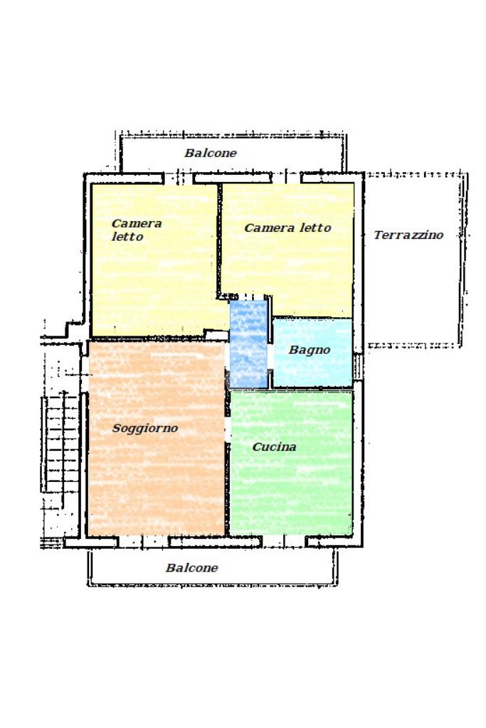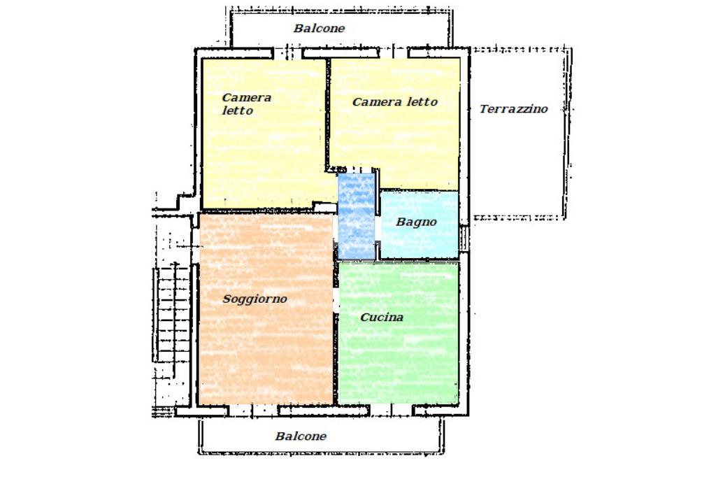 Gli ambienti interni comprendono un soggiorno a vista, una cucina abitabile dotata di fracassé, un disimpegno, due camere da letto, un bagno, un terrazzino a livello e due balconi, offrendo spazi confortevoli e funzionali.